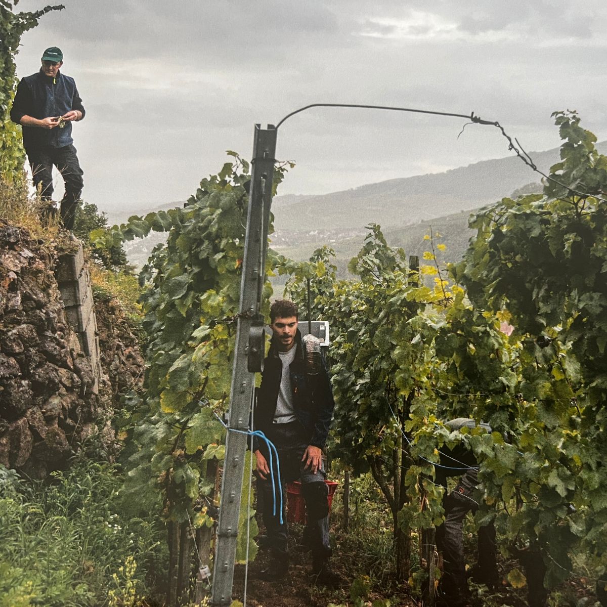 Sur la couverture du livre, vous reconnaîtrez peut-être Clément, ami d’enfance de Jacky et membre de longue date de notre équipe. Et dès les premières pages, les scènes de vendange sur les terrasses du Grand Cru Schlossberg vous plongeront au cœur de nos vignes, avec les caissettes sur le dos d’Alan sous la supervision d’Éric.